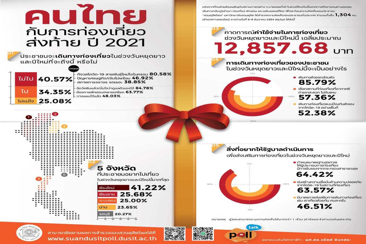 수안두짓대학교 수안두짓 여론조사 태국인에 대한 설문조사 결과와 2021년 말 전국민의 의견을 조사하여 공개합니다. 2021년 12월 6일부터 9일까지 총 1,304명(온라인 설문조사)이 연말연시 여행을 다녀왔습니다. 결과는 다음과 같이 요약할 수 있습니다.