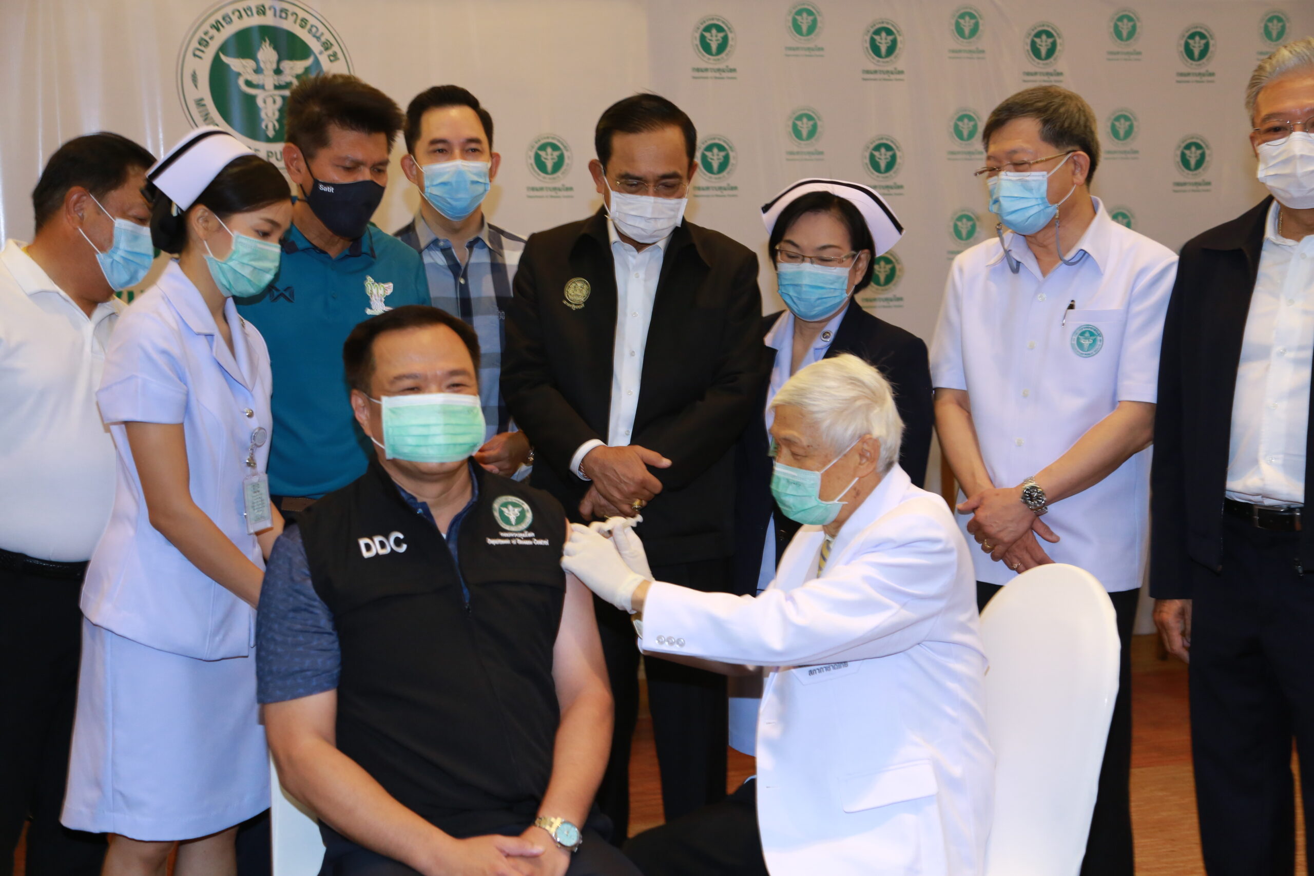 아누 틴은 오전 7시 30 분 논타 부리 티 바논로드에있는 밤 라스 나라 두라 감염병 연구소에서 쁘 라윳 찬 오차 총리가 참석 한 가운데 예방 접종을 받았다.